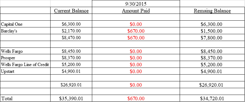 I talked with my fiancé and she agreed with my debt reduction strategy; so, I’ve decided to focus on paying off the Barclay’s card and then move on to just having the Wells Fargo Line of Credit and the Capital One credit card to focus on. I used a balance transfer to completely pay off the TD Ameritrade card, so I can focus my payments between three revolving debts vs. four. I still use credit, but I only charge enough that I pay off within 30 days of making a purchase. It’s important to still use credit when you need it to stretch your cash flow for the month. However, if you can’t pay the balance off within sixty days, then you don’t need it. Revolving lines of credit are meant to cushion cash flow and increase time, not cover day to day expenses.