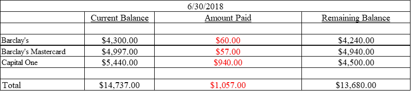 At the end of June, I faced something I hadn’t faced in a long time. My wife and I traveled to Delaware to visit her grandfather, and the trip was meant to be relaxing for me, but instead I felt heavy, and tired. Unfortunately, there were moments in our trip that didn’t make it a vacation, but marriage is for better and for worse. Even if the worse is yourself. In the end, I was glad to be spend time with her and her grandfather, and I was glad to be able to get away from home and work. This month I focused more toward the Capital One card. After discussion with my wife, I’ve decided to focus on paying off one of my other debts. When you’re seeking to be debt free, make sure that you surround yourself with people that can give you sound and good advice.