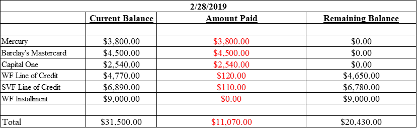 At the end of February, all my credit cards have been paid to zero. After discussion with my wife, and explaining the benefits of the installment loan, I got a $9,000 installment loan, and used $1,840 which is a combination of my normal debt reduction payments plus an extra amount to pay all my credit cards to zero. This moment is the 1st since my early 20’s that I’ve been able to pay my credit card debt to zero. I thank God for this moment, and even shared the zero balances with my wife in celebration.