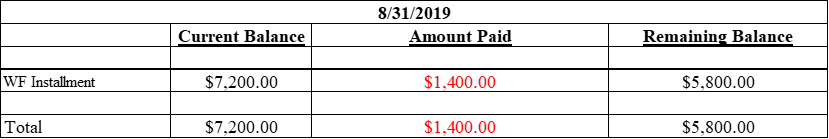 At the end of August, I am even closer to paying off the WF installment loan. Having paid off all my other debts, I am able to focus even more of my income toward paying the loan off. Regardless of what your debt repayment strategy is, I stress the importance of changing your financial behavior and attacking your debt. Every penny that you pay toward interest, you are robbing from your own future.