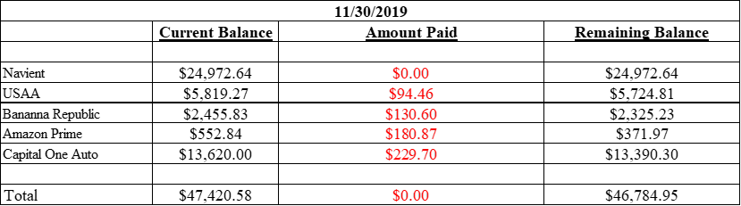 We wrote up a contract, and I made sure my wife agreed before signing any paperwork. I realized going forward that my wife had to see and understand every financial decision that affected us. Below as of 1/31/2018 was our debt: