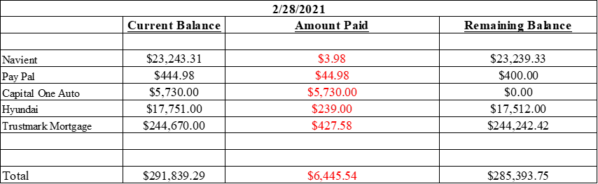 Although, we didn’t use any of the inherited money to pay off debt, we did come into agreement about me removing some money from a savings account to assist in completely paying off the Capital One auto loan. We now own our car debt free!!!! This car that we purchased two years ago had a six-year term, and we were able to pay it off in two. I had hoped it would be in the next few months and yet now it happened within the first two months of 2021. This month I also closed out a checking account that I had for many years, because I want to bring our finances even closer together. It’s the beginning of something that is ours, and the end of a period of my life where it used to be just about me. Now we can move on to my student loan. How hard is your debt free journey?